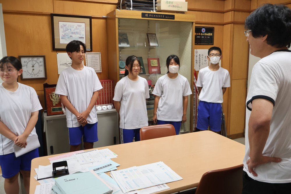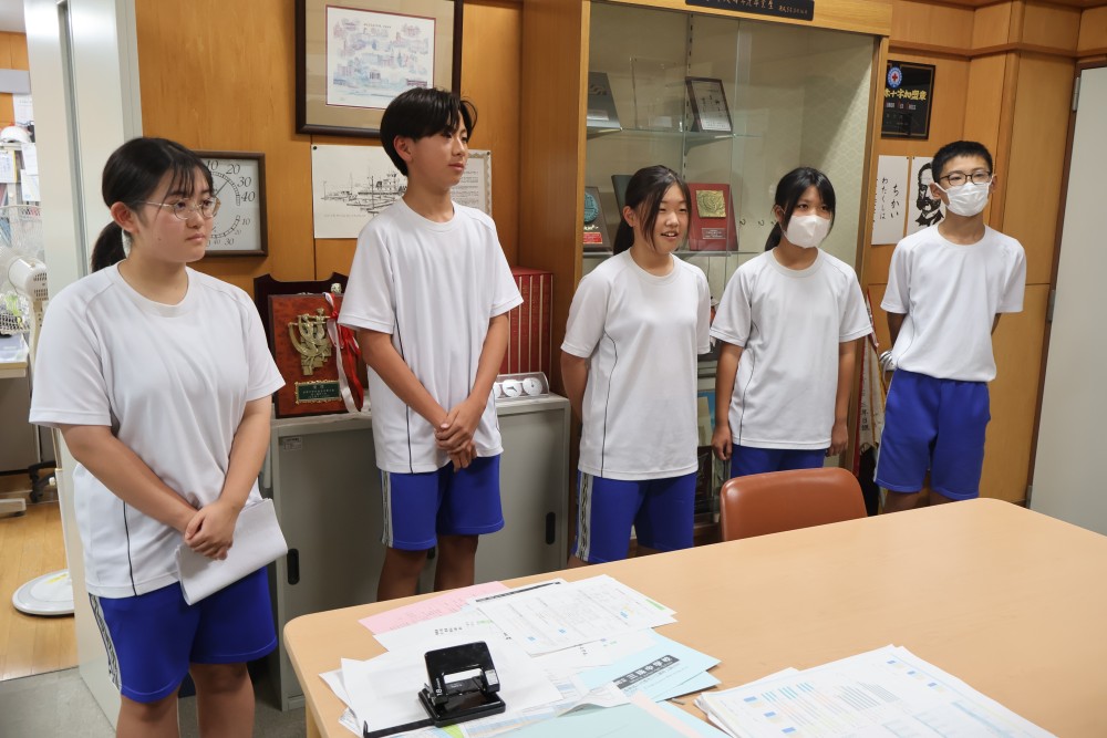 今日の昼休み、生徒会長先導のもと、男女バレーボール部・ソフトテニス部・野球部の部長さんが校長室を訪ね、あさって24日(水)から10月3日(金)までの期間の平日の朝練習とジャージ登下校の許可をお願いに来ました。男子バレーボール部部長さんが4人を代表して、「日々の授業や生活面をしっかり頑張るので許可をお願いします!」と述べ、その言葉を信頼して朝練習とジャージ登下校を許可しました。1・2年生の運動部員は希珠祭の次は新人大会への取組を通して、部活動の技術だけでなく人間力も高めていってほしいと思います。