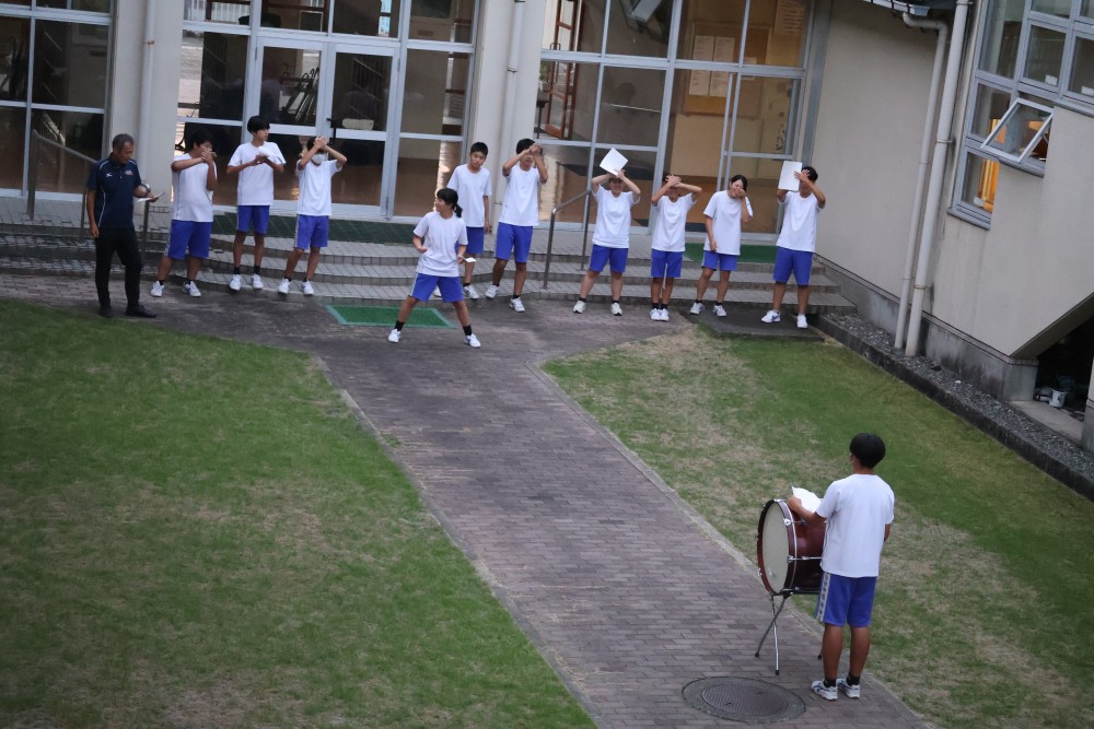 放課後、総合文化部が活動していた2階北棟廊下から中庭に目をやると、3年生が新人大会壮行会に向けて、応援の練習をしていました。新人戦の主役は1・2年生ということで、この壮行会では毎年、3年生が応援を担当しています。大切なテストが迫っているというのに3年生は大変です💦それでも後輩たちのために練習を頑張る3年生。この姿を見れば、ますます練習に力が入るというものです。3年生の頑張りに1・2年生が応える。三珠中の∞(輪)は、こうしてつくられていくのだと感じました。