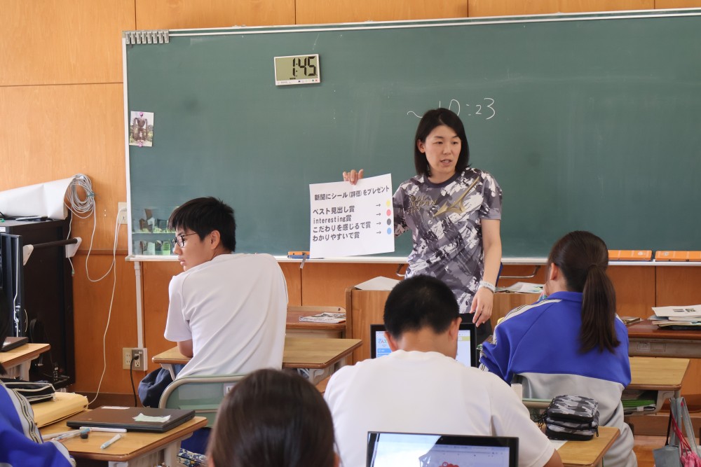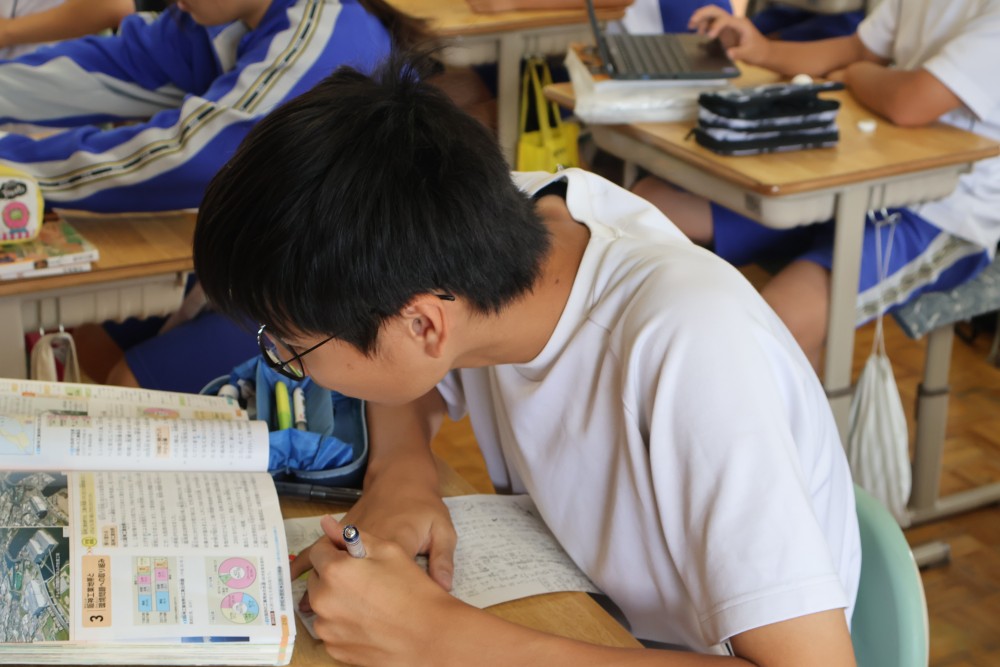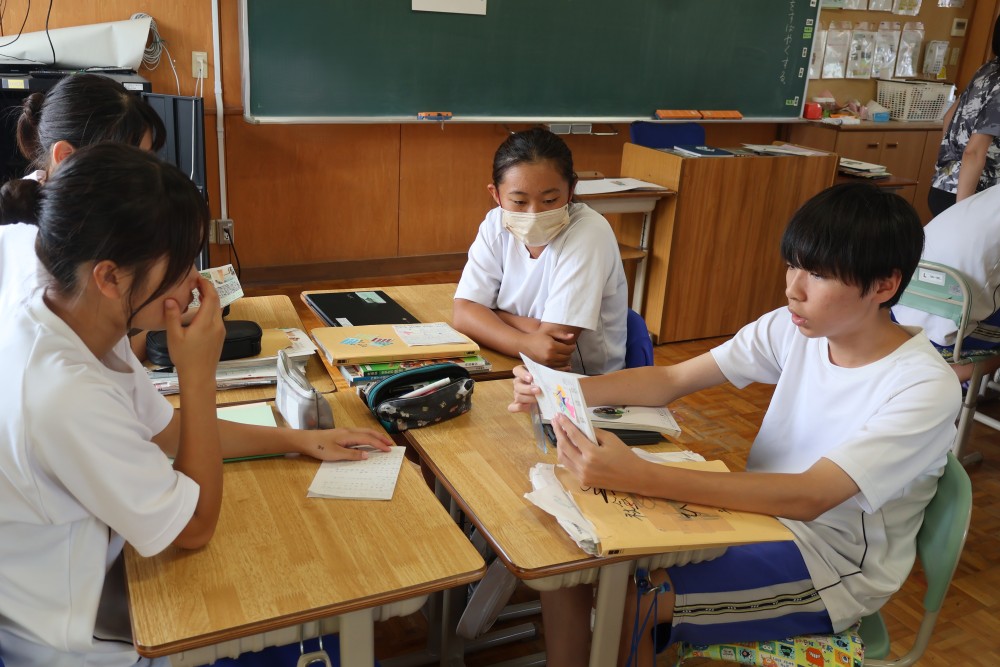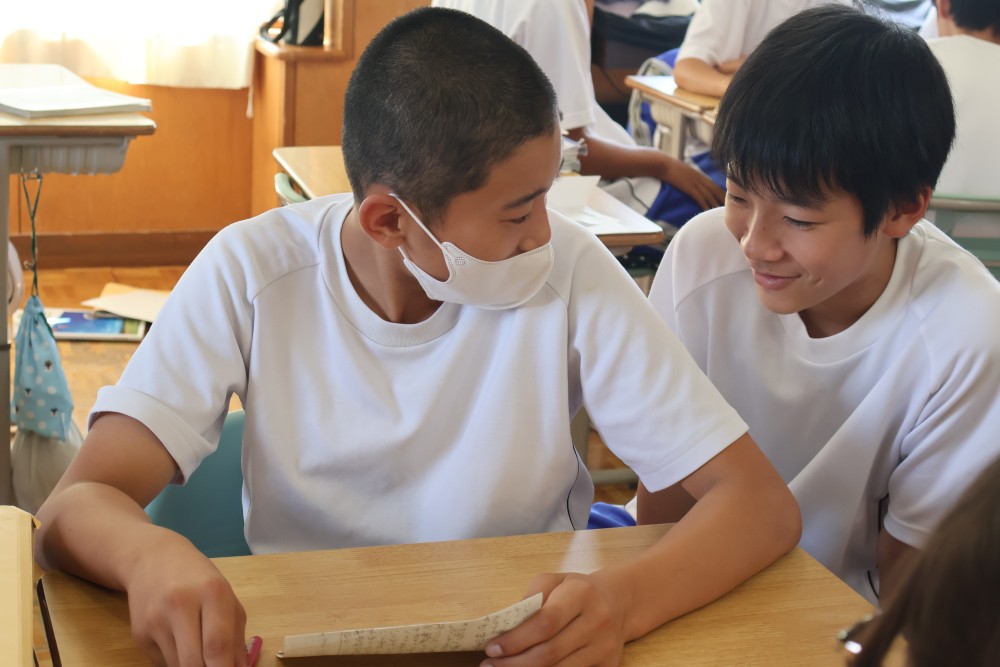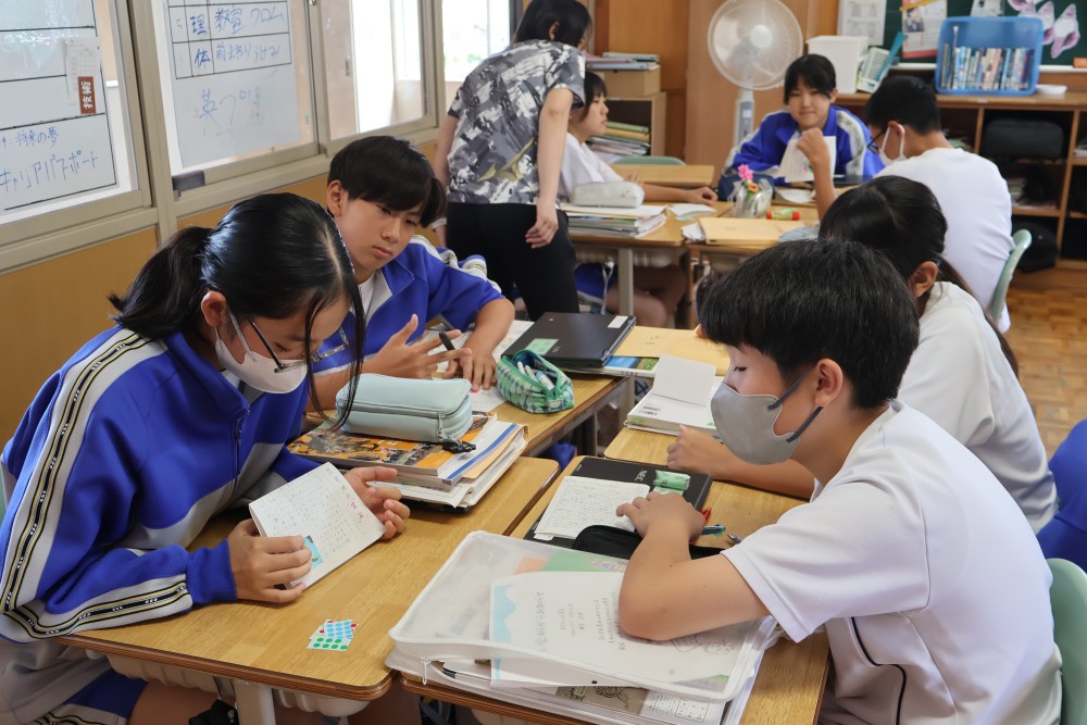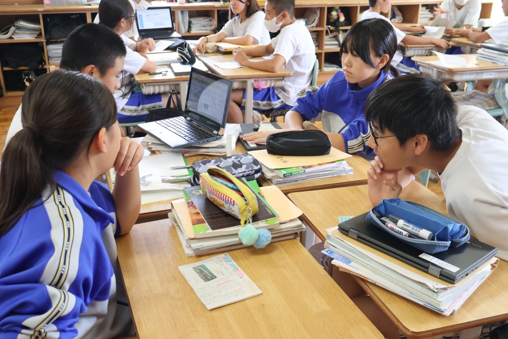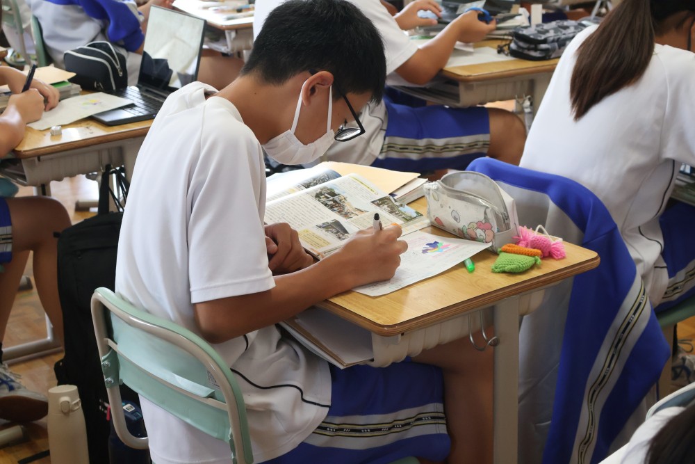 本日は2時間目、2年生社会の授業を参観しました。今日の授業の後半では、一人ひとりが『近畿地方』に関するテーマを決めて作った新聞を発表するとのことで、その様子を見学させてもらいました。琵琶湖に済む「ビワマス」や「大阪万博」、「奈良の鹿」など話題は多岐に渡っていて大変興味深く見させてもらいました。何より「いいなぁ」と思ったのは生徒たちが能動的に学習していることです。「知りたい」・「分かるようになりたい」という気持ちは学力UPの最良のエネルギーです。どんな学習に対してもそんな気持ちをもてるようになると良いですね。