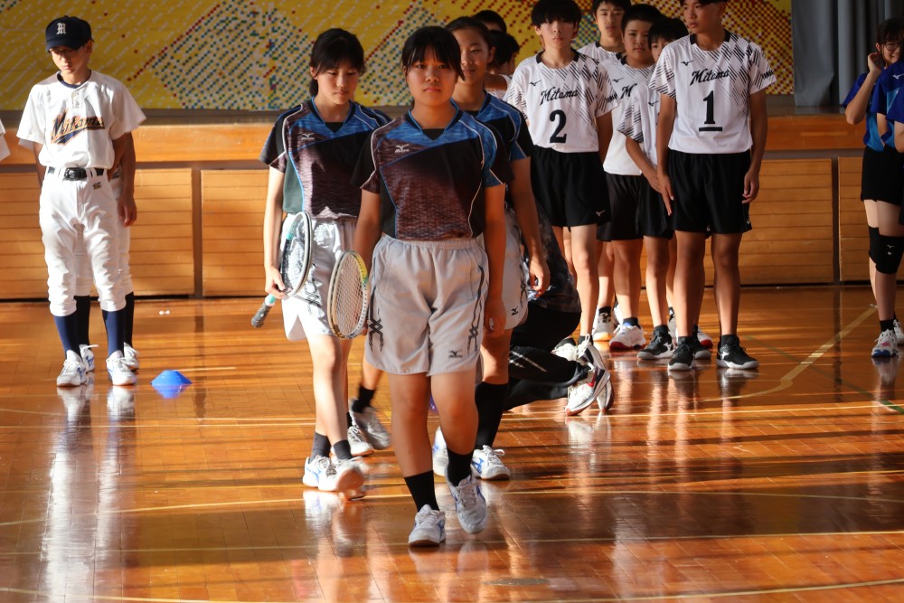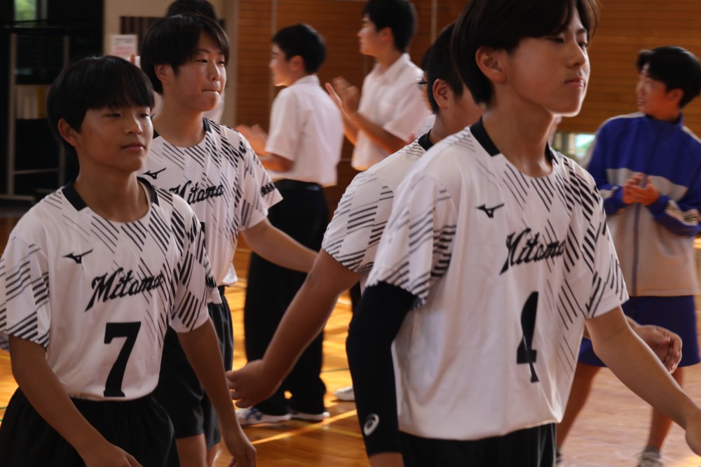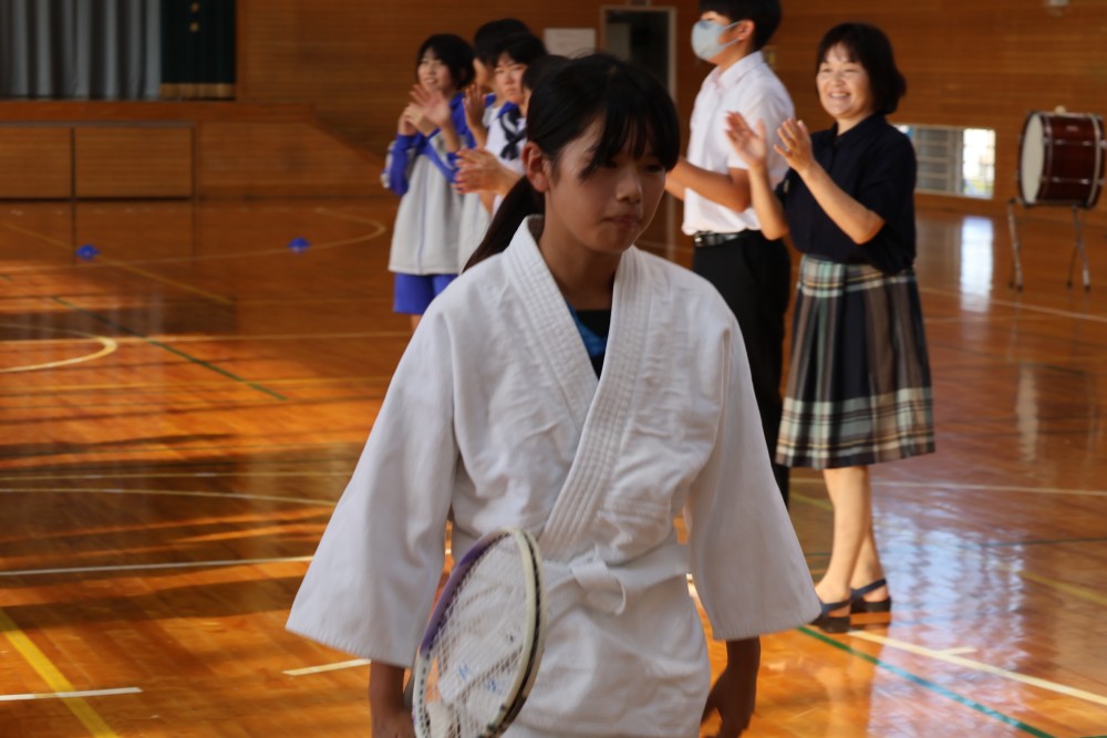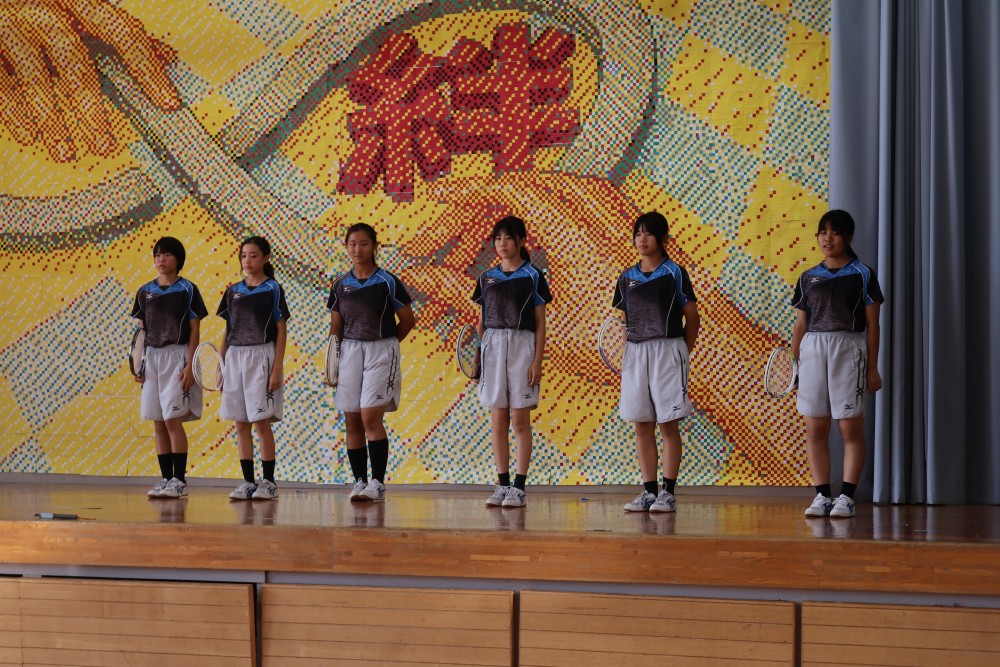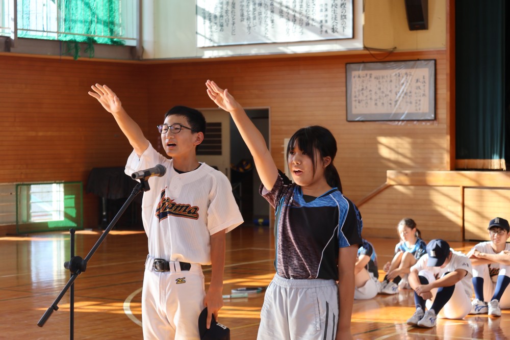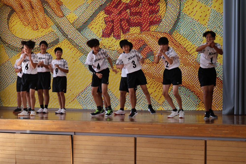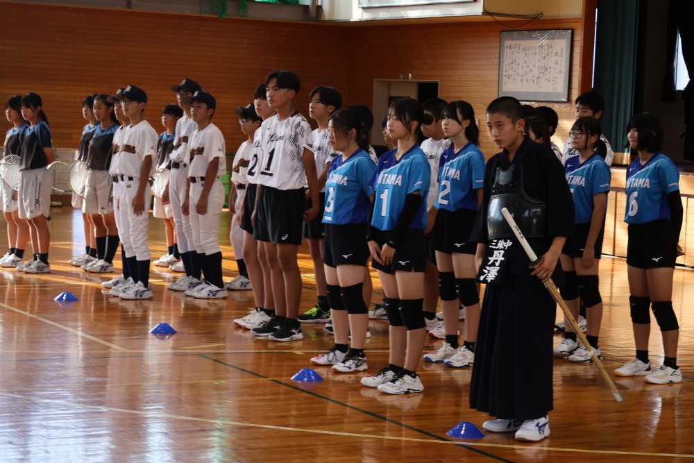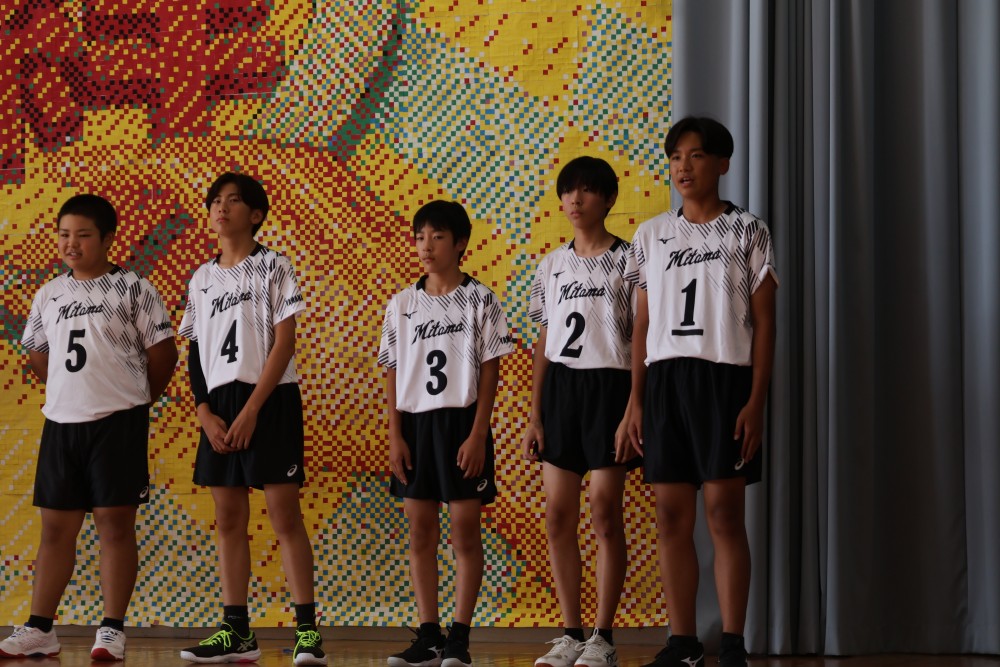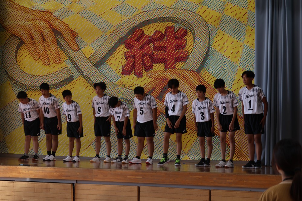 地区新人大会が2日後に迫った本日の放課後、選手壮行会が行われました。新人大会に出場する1・2年生の運動部員に対して、3年生を中心に気持ちの入った温かい応援を送りました。過日、HPでお伝えした通り、10月7日(火)に大切な試験を控えた3年生が後輩たちのために放課後、応援の練習を頑張ってきました。3年生の思いをしっかり受けとめた1・2年生の態度も立派でした。3年生に対する選手たちの思いが野球部代表とソフトテニス部代表者による選手宣誓や全部員による決意発表に表れていました。そして、お礼の言葉では3年生に対する感謝の気持ちがはっきりと自分の言葉で語られていて、「とても良い壮行会になったなぁ」と感じました。三珠中らしい温かな壮行会を経て、いよいよあさっては地区新人大会。自分たちのもっている力を悔いの残ることなく発揮してきてください!(剣道部・柔道部は別に県新人大会に出場します!)