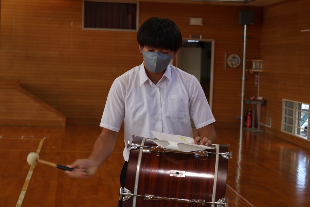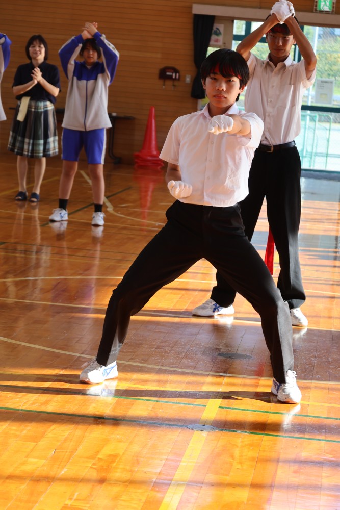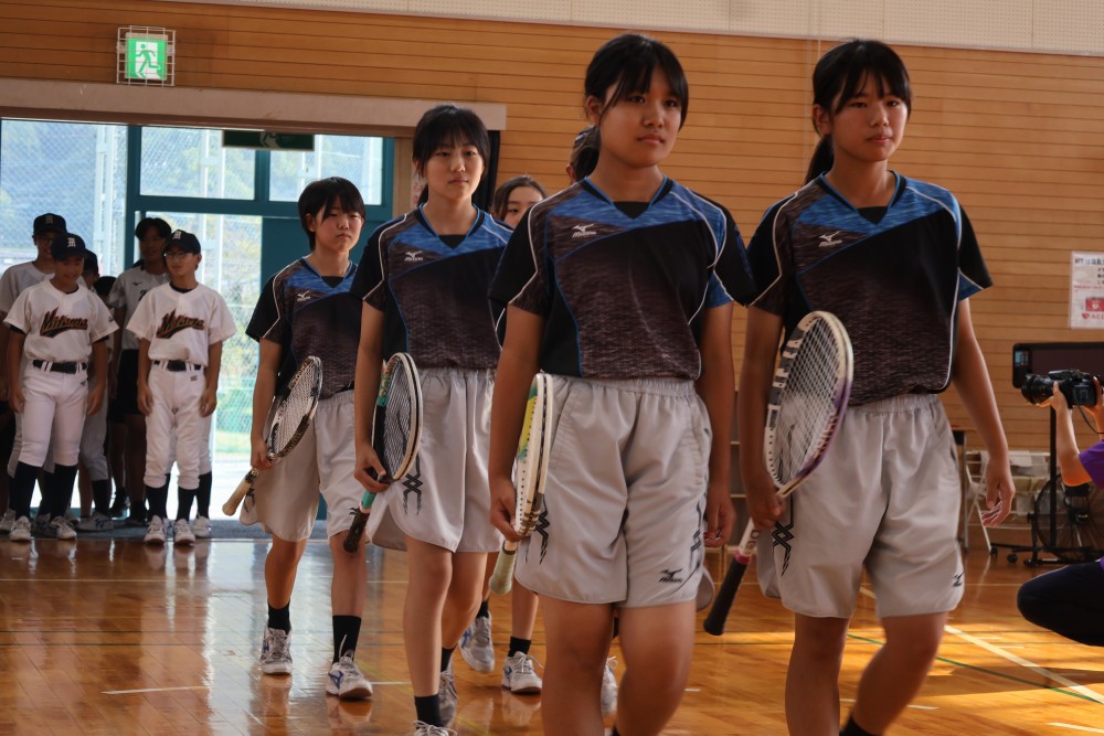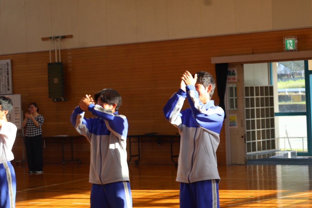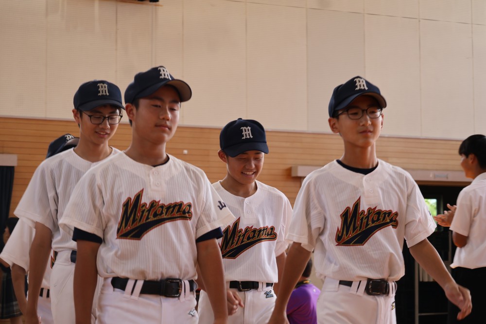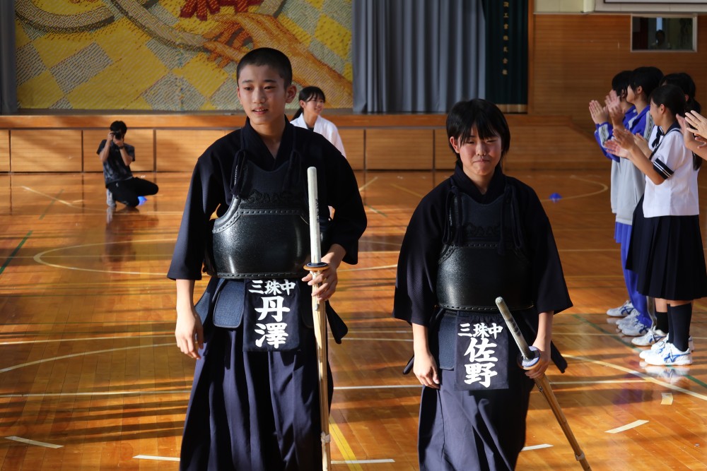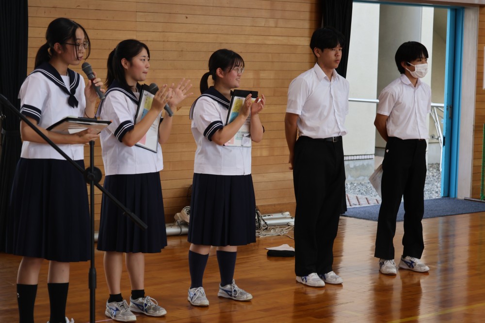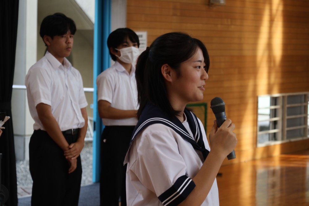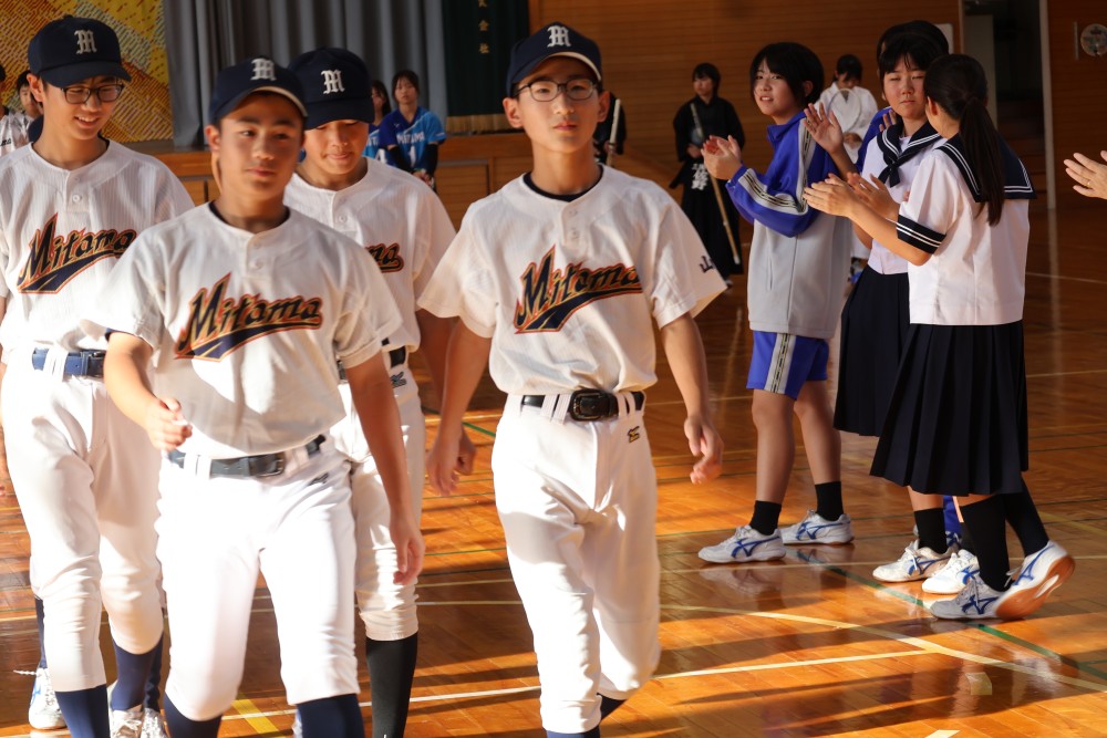 地区新人大会が2日後に迫った本日の放課後、選手壮行会が行われました。新人大会に出場する1・2年生の運動部員に対して、3年生を中心に気持ちの入った温かい応援を送りました。過日、HPでお伝えした通り、10月7日(火)に大切な試験を控えた3年生が後輩たちのために放課後、応援の練習を頑張ってきました。3年生の思いをしっかり受けとめた1・2年生の態度も立派でした。3年生に対する選手たちの思いが野球部代表とソフトテニス部代表者による選手宣誓や全部員による決意発表に表れていました。そして、お礼の言葉では3年生に対する感謝の気持ちがはっきりと自分の言葉で語られていて、「とても良い壮行会になったなぁ」と感じました。三珠中らしい温かな壮行会を経て、いよいよあさっては地区新人大会。自分たちのもっている力を悔いの残ることなく発揮してきてください!(剣道部・柔道部は別に県新人大会に出場します!)