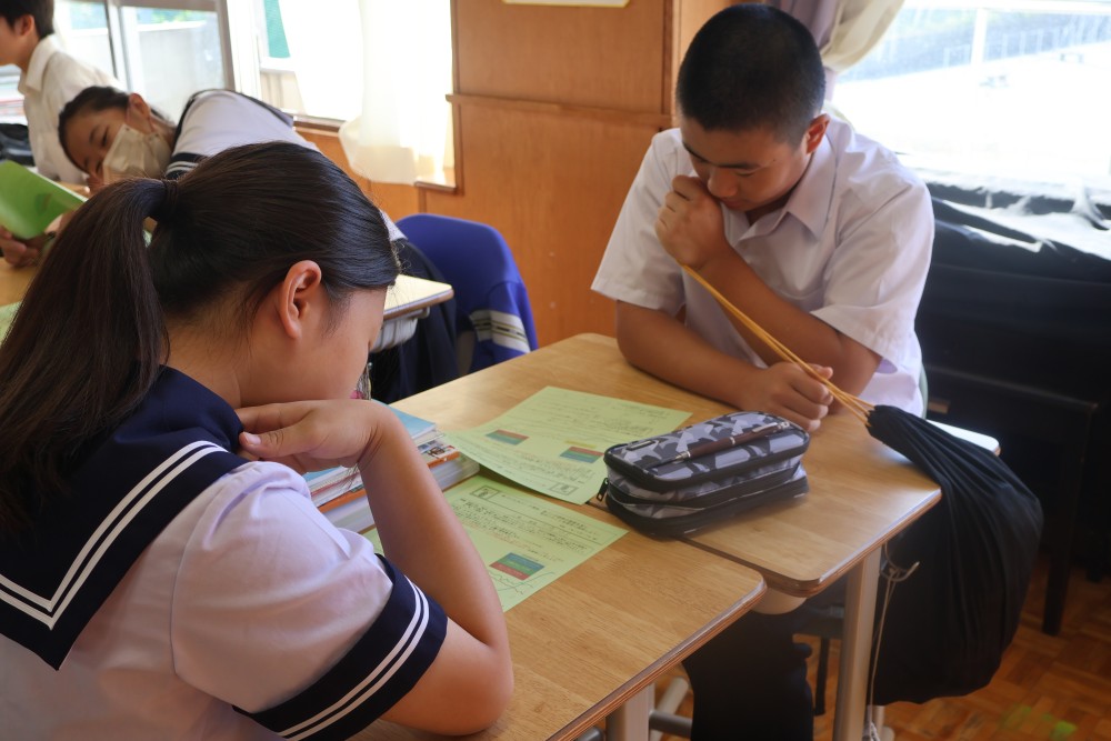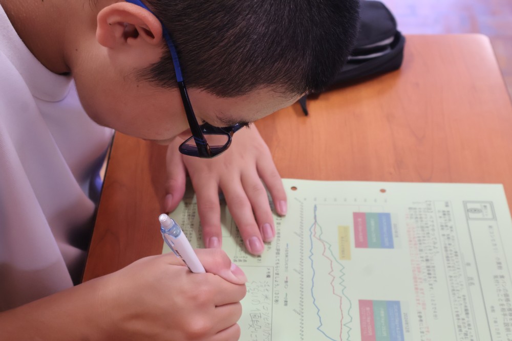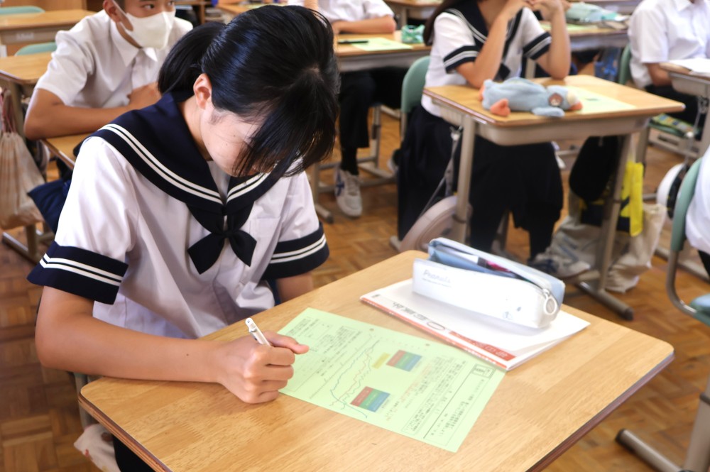 今週の「いしずえタイム」のお題は『米・小麦粉・食パンの価格の推移のグラフを見て、気付いたことを相手に説明しよう!』です。プリントの中に『2022年2月あることが始まる』とありますが、「あること」とは「ロシアによるウクライナ侵攻」です。小麦粉と小麦粉を原料にする食パンはこの時期から価格が上がり、今も高止まりしていることが分かります。遠いところで起きている戦争が私たちの食卓に影響をもたらしているのです。そしてたった7ヶ月の間に約1.7倍もの価格になった日本人の主食である米……。食糧自給率の低い我が国で起きている主食の価格の高騰は深刻な問題です。みなさんには、この憂慮すべき状況を知っていてほしいと思います。