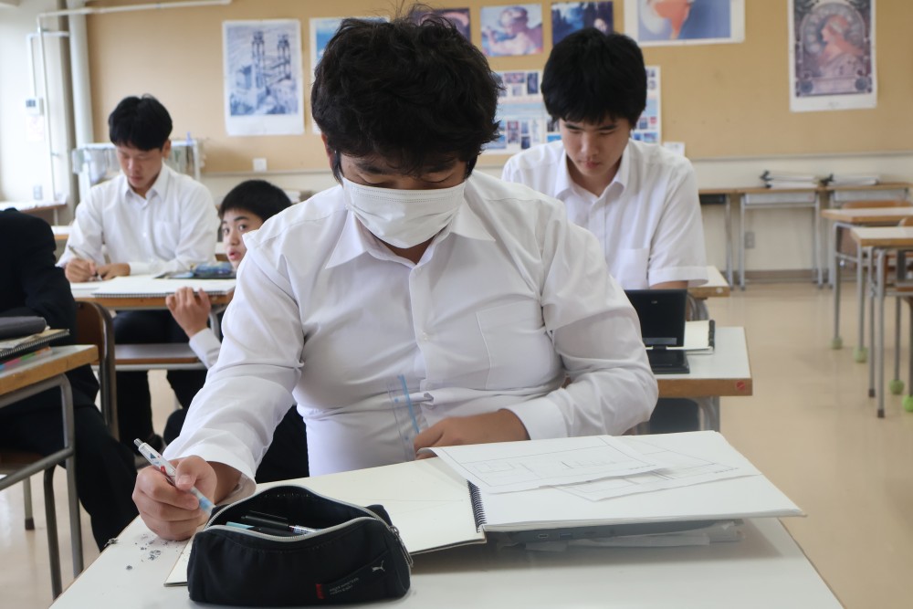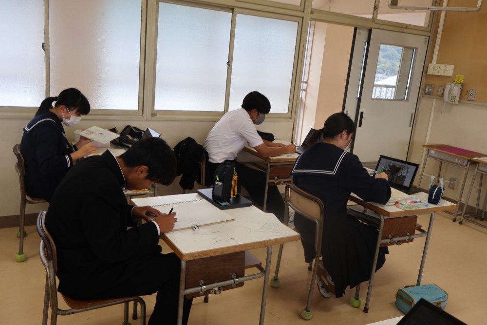 本日は5時間目、3年美術の時間を参観しました。授業では山梨県教育祭図工美術作品展の作品を各自が手がけていました。面白い構図の絵や緻密な校舎内の絵など興味深い作品がたくさん見られました。三珠中生徒の作品の審査結果はまた後日お知らせしますのでお楽しみに!