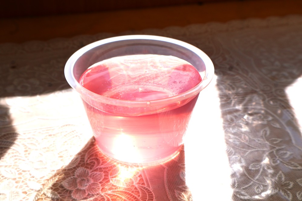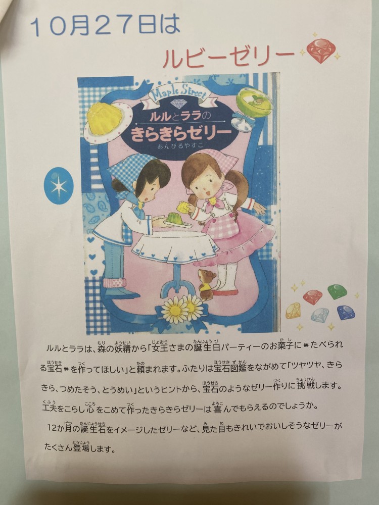 今日からしばらくの間、給食に本とのコラボメニューが登場します。今日は『ルルとララのきらきらゼリー』からルビーゼリーの登場です。陽の光にきらめくゼリーはまるで宝石のようです。
