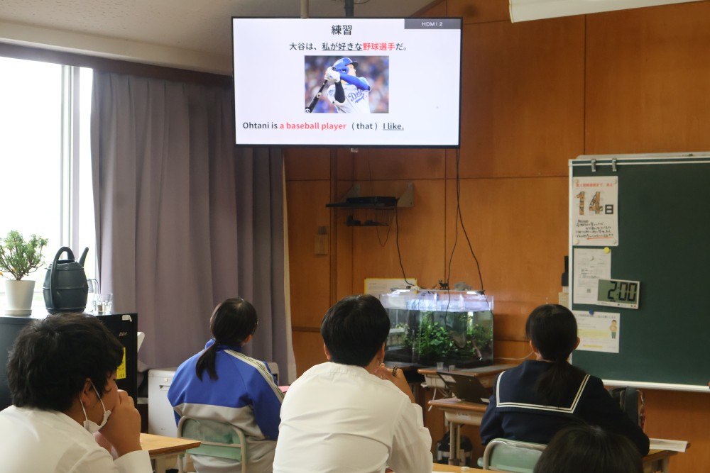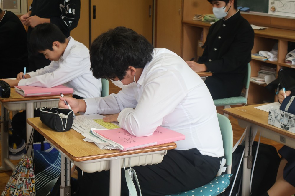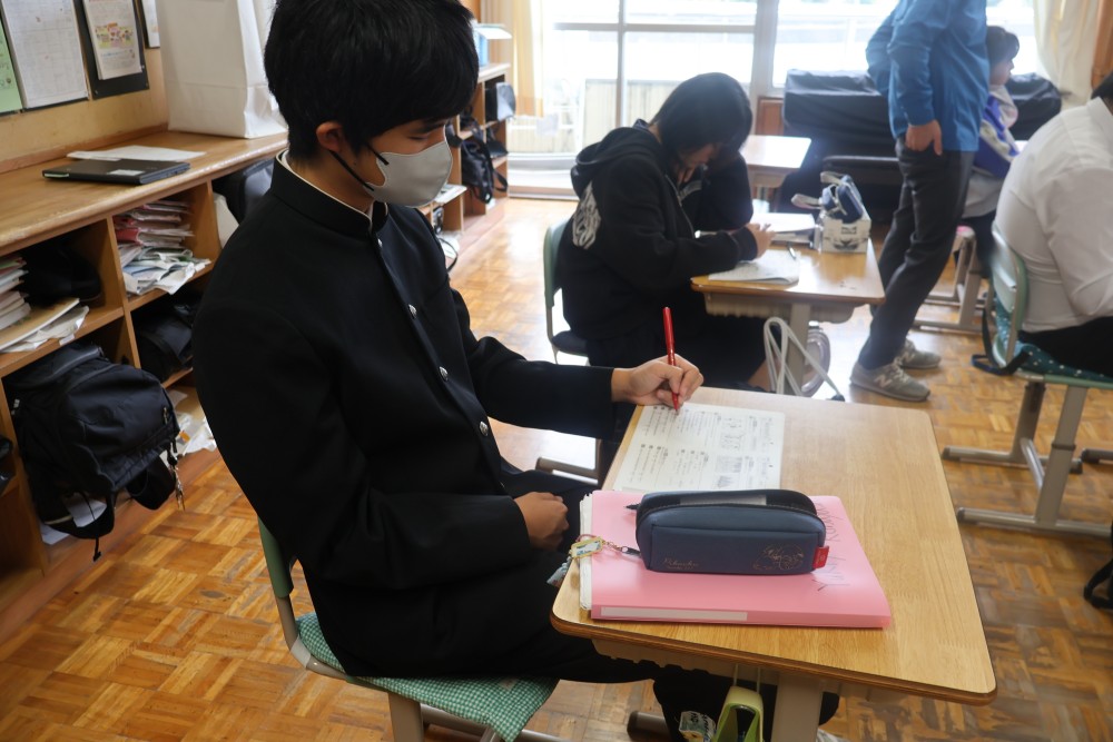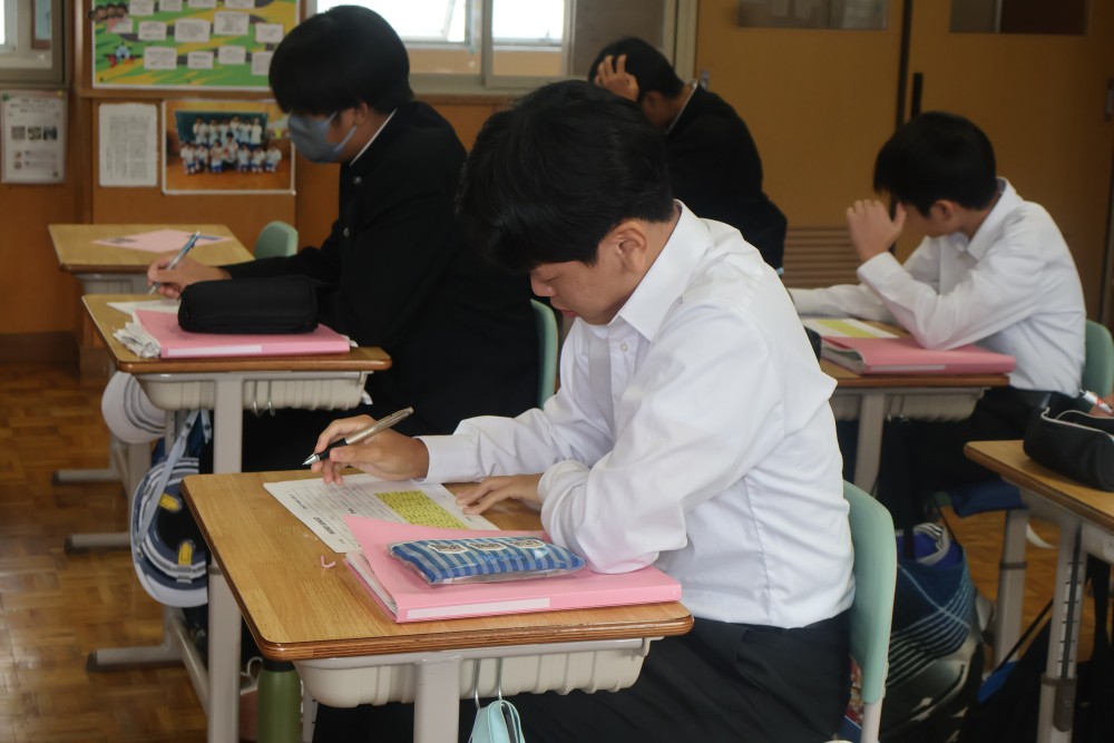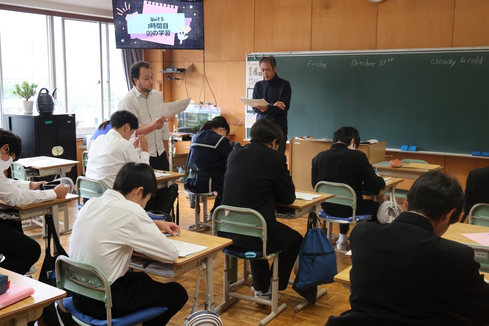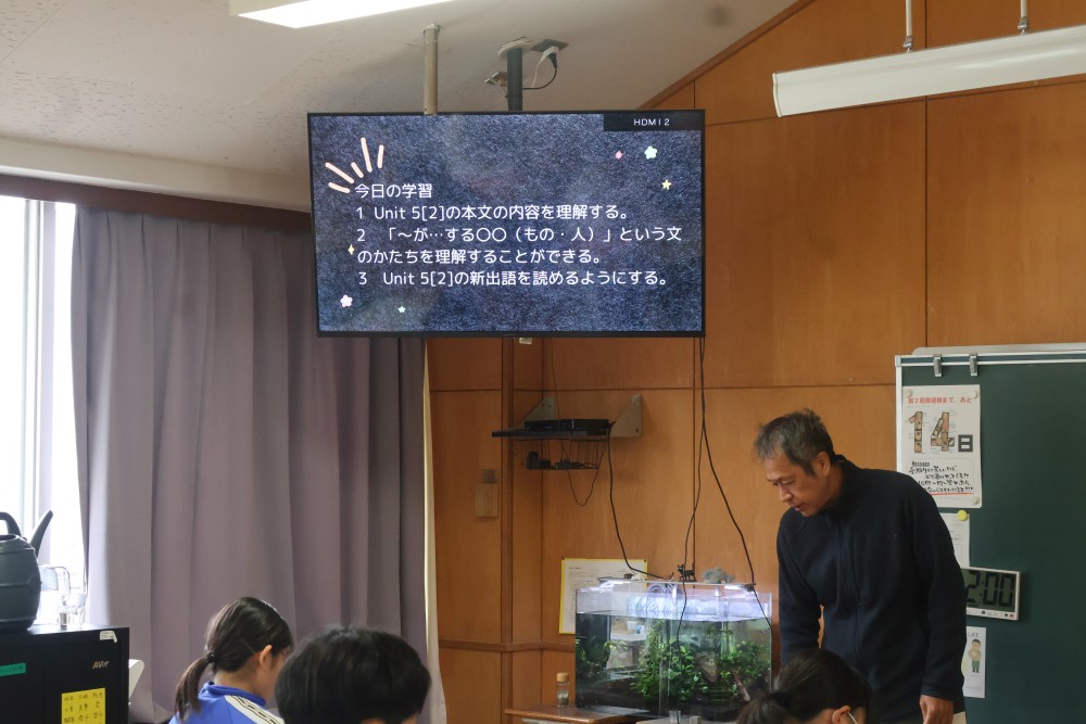 続いて参観したのは3時間目、3年生の英語です。この授業を見ての感想が「How easy to understand the lesson is !(なんて分かりやすい授業なんだ!)」です。ビンゴ⇒読むトレ⇒聴くトレ⇒教科書の内容と授業は、よどみなく流れていきます。特に教科書本文中にある重要表現の学習では、自作のパソコン教材&プリントを使って、大切なポイントを分かりやすく教えてくれていました。せっかく授業で分かったことも、そのままにしておくといつしかぼんやりとしていき、いざテストで出てきても正解にたどり着けないことはよくあること……。それを防ぐための家庭学習であってほしいと、今日の授業を見て強く感じました。