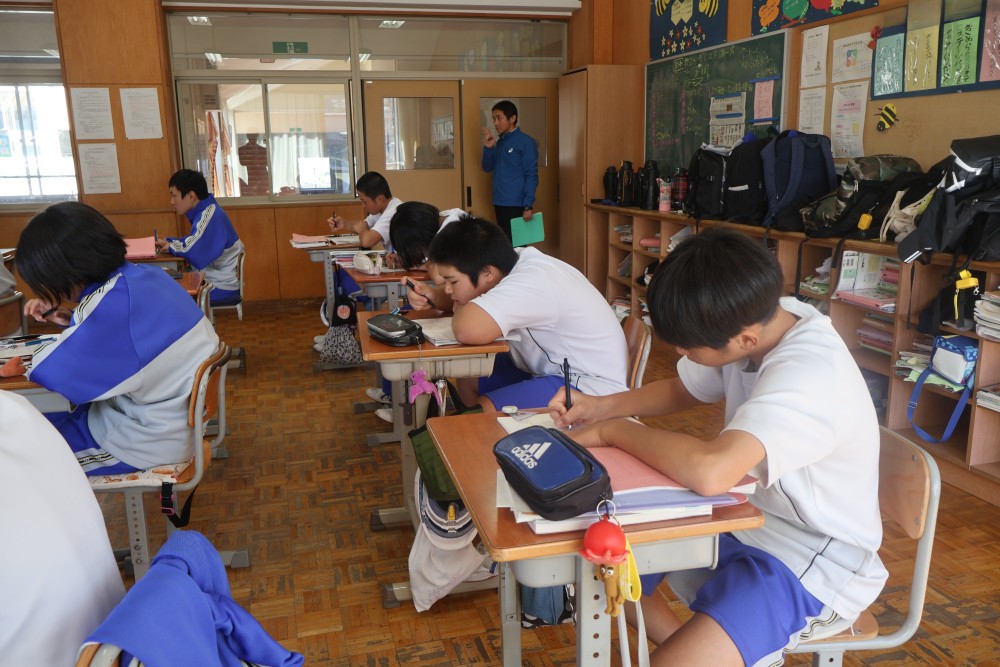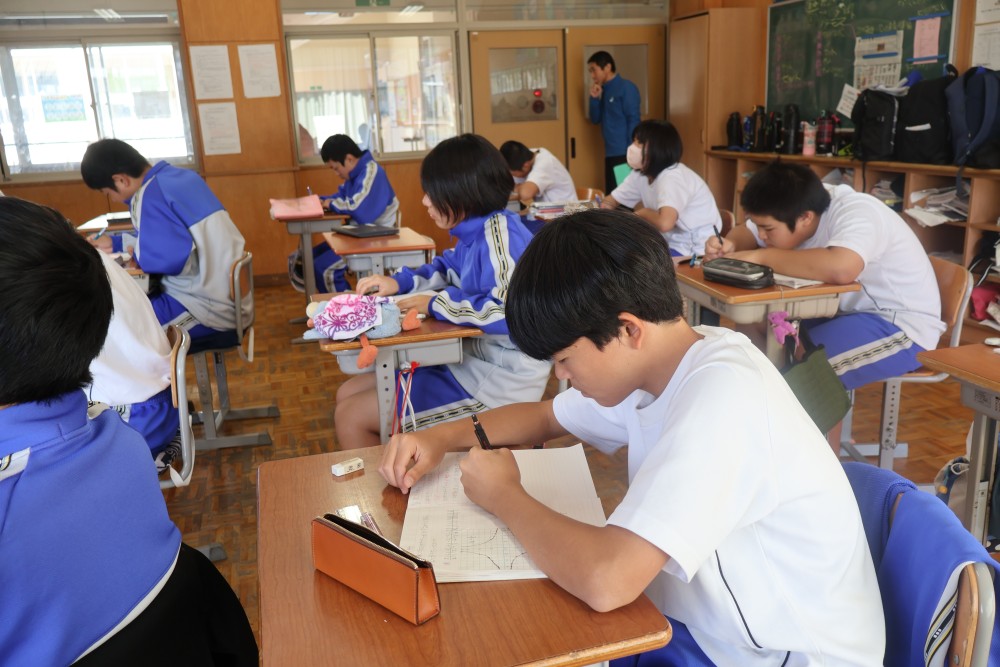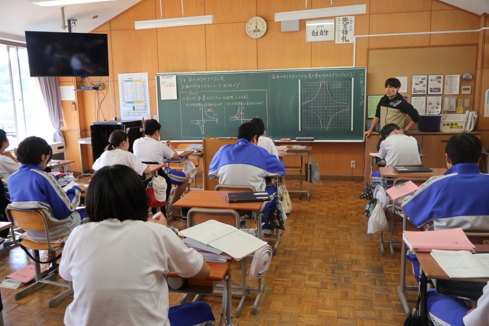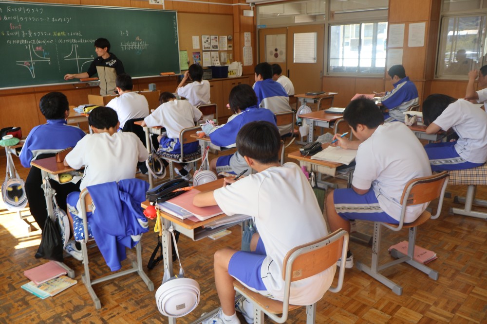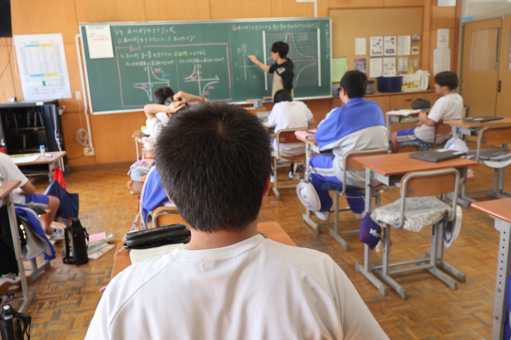 本日は4時間目の1年・数学の時間を参観しました。授業では反比例のグラフ(双曲線)のまとめを行った後、反比例のグラフの式を求める練習を行いました。誰もが真剣に取り組んでいて、大変良い雰囲気の授業でした。グラフ上の1点を選び、そのx座標とy座標を「y=a/x」の式に代入し、1次方程式を解いてaの値を求めることをみんなができていたように思います。「分かった」と感じたことは繰り返しの反復練習をすることで確かな力になります。授業で分かったことを家でもう1度やってみる家庭学習も効果的ですよ。