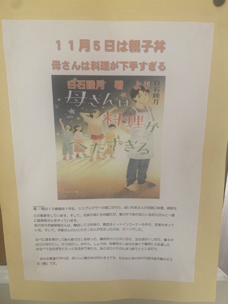 市川三郷町三珠中学校 > 今日の給食 > 今日の給食🍠11月5日(水) 2025年11月5日カテゴリー: 今日の給食 今日の給食🍠11月5日(水) 本とのコラボ給食も今日を入れて残り3日となりました。第6弾の今日のコラボ本は小説『母さんは料理がへたすぎる』です。第1回「おいしい文学賞」受賞作品で、「食」が重要な要素でありながら、家族の絆や主人公の青春と成長が中心に描かれたハートフルな作品です。