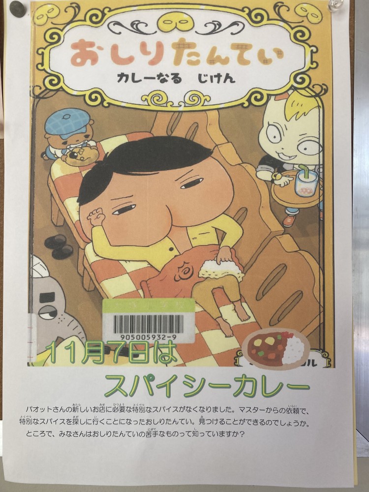 本とのコラボ給食の最終日を飾る「おしりたんてい カレーなる事件」。見た目はおしり、推理はエクセレントな名探偵おしりたんてい。主人公の見た目のインパクトと、子どもたちがもつ「おしり」や「おなら」への普遍的な興味・笑いが結びついた、こどもが夢中になって読むこの本を童心に返って読んでみませんか?ちなみにおしりたんていが苦手なものは「からいもの」です。