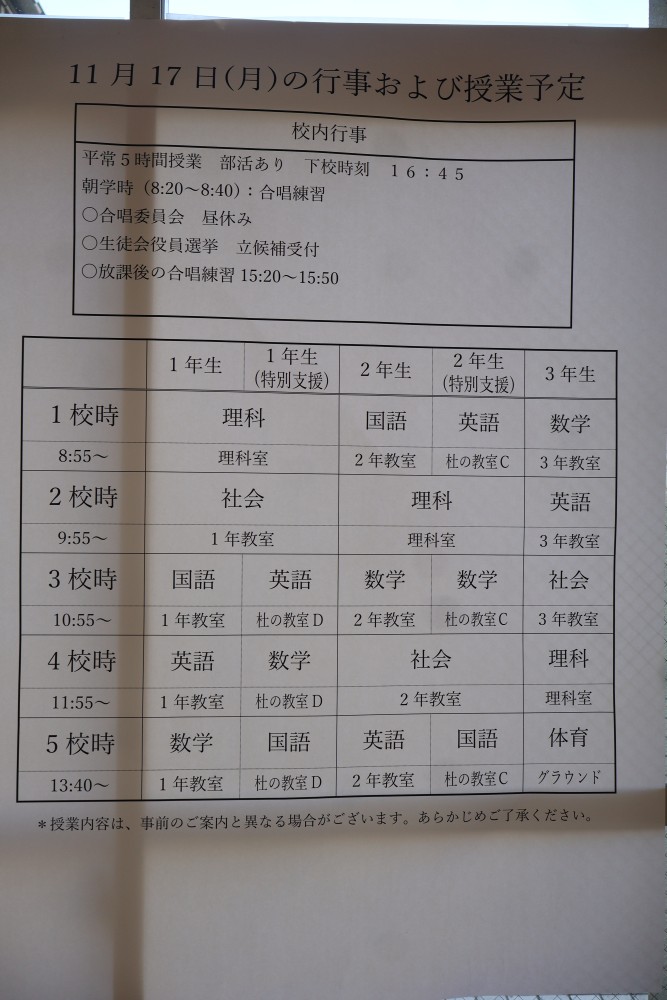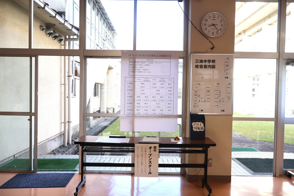 本日から県民の日(11/20)を除く金曜日(11/21)までの4日間、三珠中学校では「オープンスクール」と銘打って、給食以外の参観希望者の希望の時間帯に、学校の様子を見てもらえる期間に設定しています。今週は19日(水)に合唱発表会が予定されているので、その日に合わせて来校してくださる方が多いのではないかと予想しますが、オープンスクール中は、何度来ていただいても大歓迎です!防犯上、学校玄関は常時施錠されていますがインターホンで来校の旨を伝えていただければすぐに対応いたします。どうか生徒たちの日常の様子をご覧になっていただけたら幸いです。心よりお待ちしています。