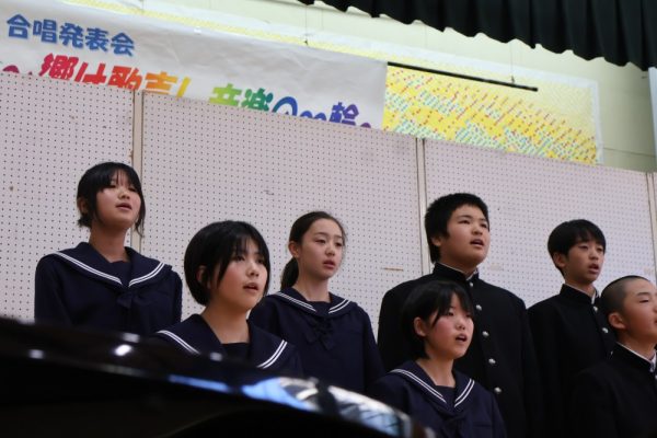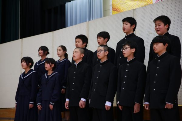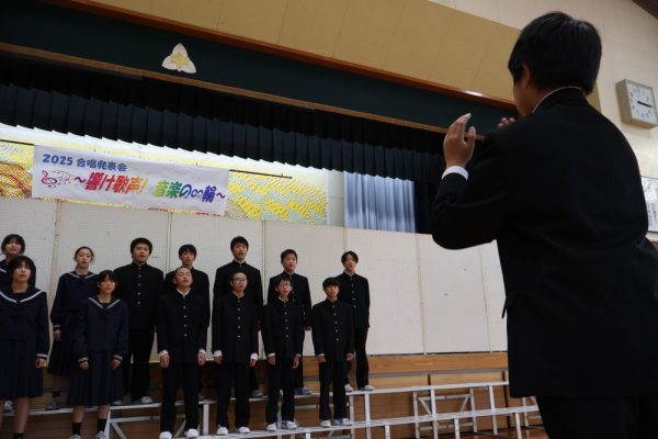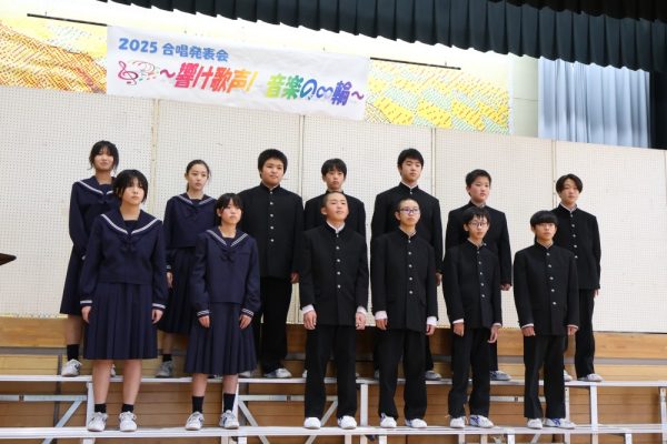 学年合唱1番手は1年生による♪COSMOS♪です。1番手のプレッシャーもあったと思いますが、それをはねのける力強く素敵な合唱でした。指揮者も伴奏者もよく頑張りました。以下は講師の落合先生の講評です。『女声4人での発表、きっと、どきどきしたことでしょう。一人ひとりが基礎を大切にしたとのこと。それは素晴らしいことです。選曲が良いね~。第1声から、しっかりと会場に伝わってきました。ユニゾンからコーラスになった時も、それぞれのメロディーラインがはっきりしていて良かった。4人の女声はしっかり歌いきっていました。ソプラノもアルトも正確で素晴らしい!男声、丁寧、正確に全力で歌いきりました。君たちは力があります。さらにみんなの声を1つにすることを心がけて、楽しんで歌ってください。中学1年生としては大変立派な演奏でした。ありがとうございました。』