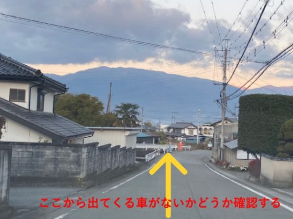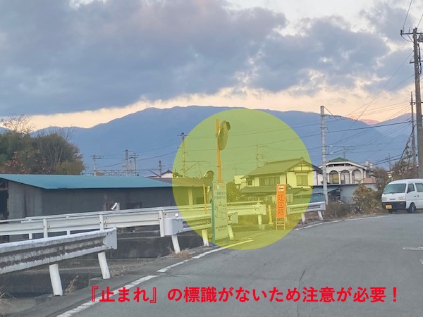 11月4日から一城橋の通行止めのための迂回路として、大塚地区の通学路の一部の交通量が増えていることをお知らせしました。特に危険を感じた道林踏切付近に立ち、通学路を自転車で通る生徒がいるとき、脇から出てくる車に停まってもらういわば交通整理の様なことを行っていたのですが、昨日、そのような場面で乗用車に乗っている人から注意を受けてしまいました。「優先道路を通る生徒の安全のため」と考えて行っていたのですが、何が問題なのかと調べてみたところ、道路交通法第6条より、交通整理(車両を停止させたり、進行させたりすること)を行う権限を持つのは、基本的に警察官または交通巡視員に限られているとのこと……。良かれと思ってしていたことがどうやら適切ではなかったようです。写真の場所には「止まれ」の標識がありません。運転手は「止まれ」の標識がない限り、前方の状況を確認し、自らの判断で優先道路の通行を妨げないように減速・停止する義務がありますが、絶対に止まってくれると思い込むのは危険です。どうか写真の箇所では慎重な運転を心がけてください。