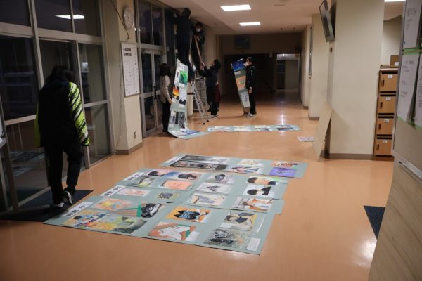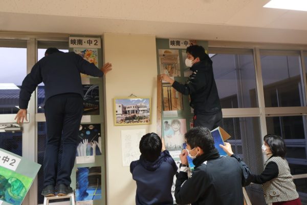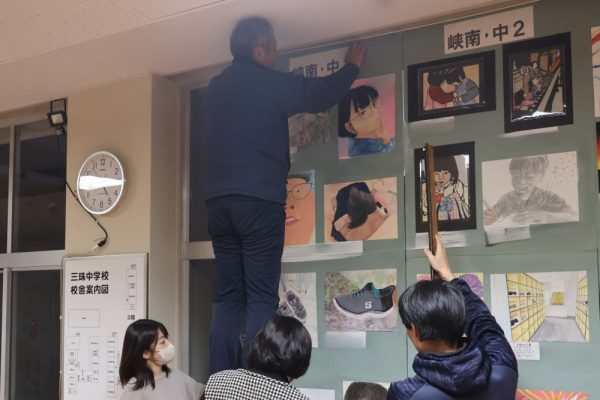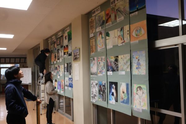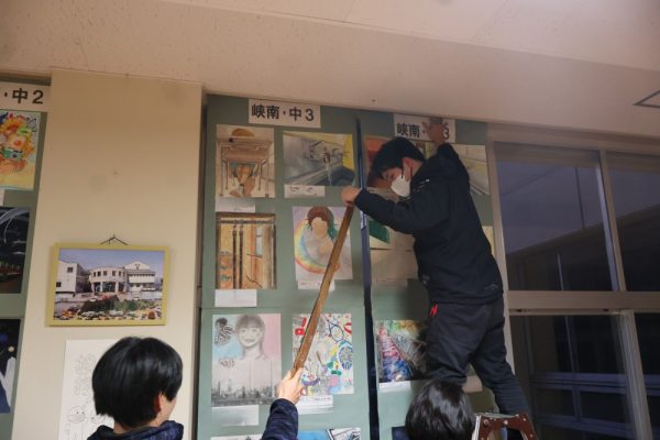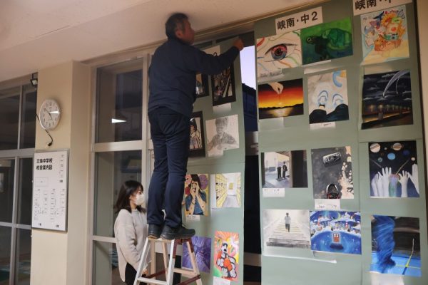 本日、職員会議終了後、山梨県教育祭図工美術作品展・峡南地区巡回展(県特選の作品を集めたもの)を玄関に掲示しました。明日の朝から今週いっぱい、峡南地区の傑作を見ることができます。その中には本校生徒の作品もあります。是非、じっくりと見てほしいと思います。