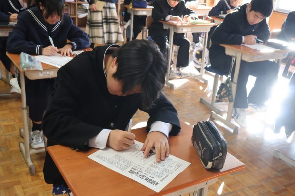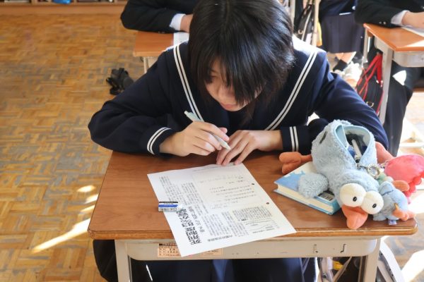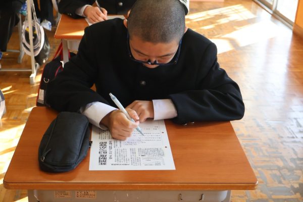 今年度2回目のさんスタ交流会に向けて、本日のさんスタの時間帯に全校で共通の記事を読み、自分の意見をまとめました。今回の記事のテーマは「日本の死刑制度」についてです。2024年内閣府の行った世論調査では「死刑もやむを得ない」という容認派が約83%にのぼったそうです。一方で、先日、学校便りで紹介した本町出身のドキュメンタリー監督・笠井千晶さんが手がけた「袴田事件」のようなこともあり、その是非を考えることは大変難しいことのように思われます。生徒のみなさんには短絡的に賛成・反対するのではなく、いろんな想像力を働かせて考えてほしいと願います。
