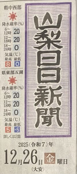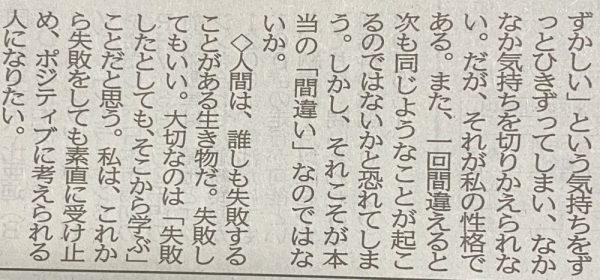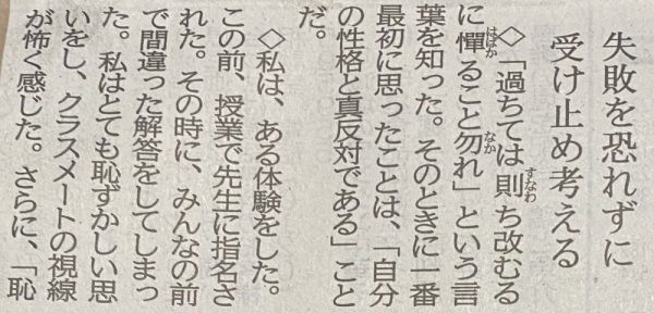 本日の山梨日日新聞の8面『私も言いたい〜10代の意見〜』の欄に、本校2年生の声が掲載されていました!市川三郷町では小中学生を対象に『ことばの森』という作文教室を開いてくださっていて、年に数回、作文の添削を、地元のボランティアの方々がしてくださります。そして、この『ことばの森』の優秀作品に選ばれると、山梨日日新聞のこのコーナーに掲載されるのです。今年度 三珠中から初の掲載となったこの作文は、失敗を恐れずにそこから学ぼうとするポジティブな内容もさることながら、これまでの自分を変えていこうとする強い意思も感じられます。三珠中学校にとって1日遅れの良いクリスマスプレゼントとなりました。