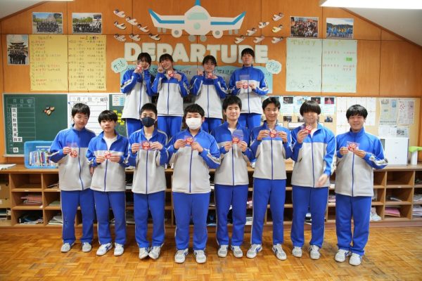 総合文化部から心のこもったプレゼントをもらった3年生に、もう1つのサプライズが待っていました。なんと1・2年生のときの主任の先生から、『幸せのだるまさん』が14名全員に贈られたのです。明日、受検を控える人はもちろんのこと、既に内定をもらっている人にとっても大変うれしいプレゼントとなりました。離れていても、いつも自分たちのことを想ってくれている人の存在に大きな勇気をもらいました。『明日はきっと良い日になる』。そう確信する放課後の出来事でした。