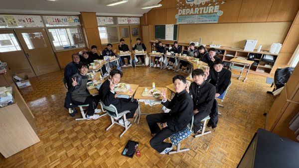 3年生にとって今日が最後の給食。献立表を見ると『🌸中学校卒業お祝い給食🌸』とあります。みんなでぐるりと円を作って最後の給食の時間を楽しみました。とっても良い写真です!