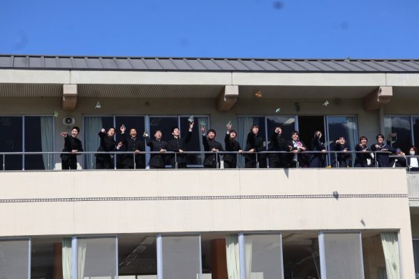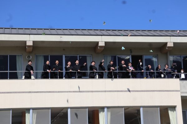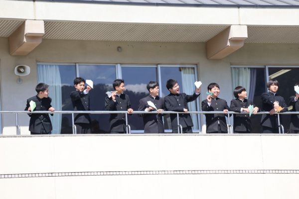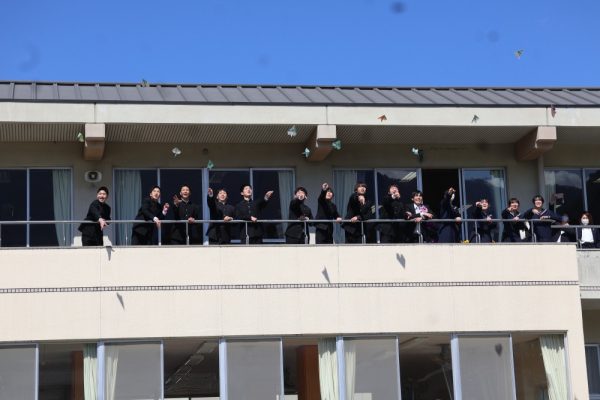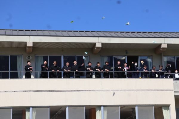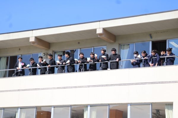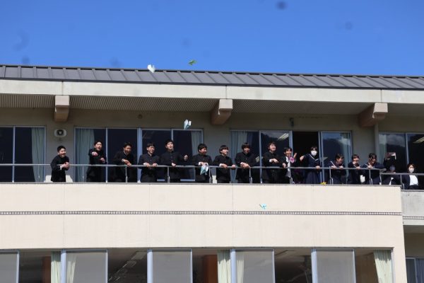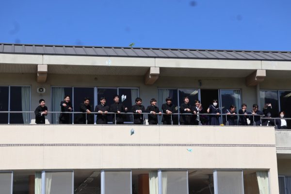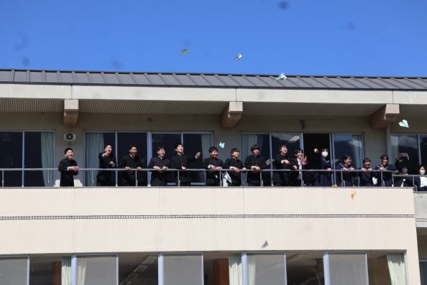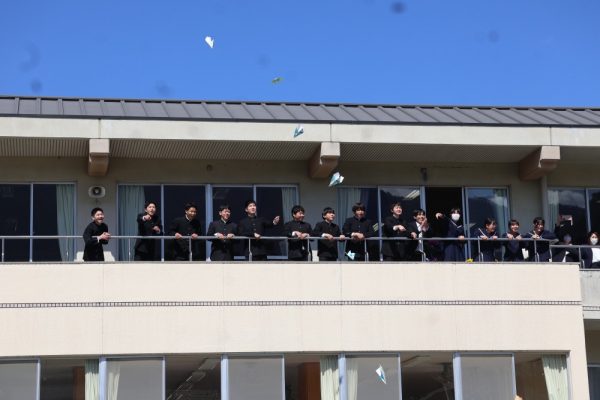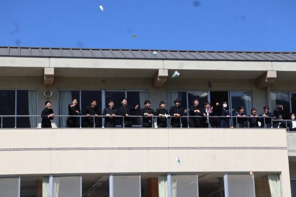 卒業は義務教育終了の到着点であると同時に、新しい生活への出発点でもあります。本日、卒業生の最後の学活の終わりに、この1年間の学級目標として掲げてきた『DEPARTURE(出発)』に相応しいイベントを担任の先生がセッティングしていました。それが、新しい世界への『DEPARTURE』を連想させる『紙飛行機投げ』です。卒業生の紙飛行機たちは真っ青な空を優雅に飛んでいきました。これからの皆さんの活躍を心から祈っています。